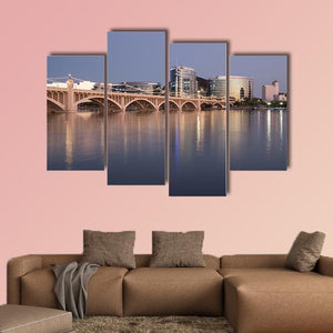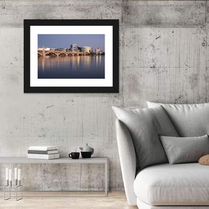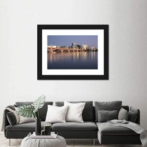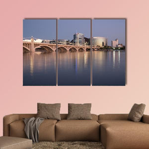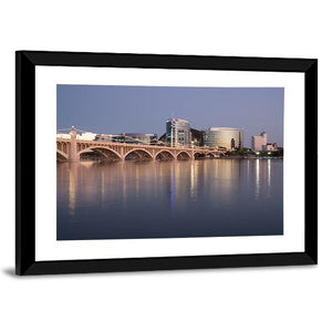 This canvas depicts the Salt River at Tempe Town Lake with an arched bridge, modern glass buildings and lights reflected on the water. Rendered in a photorealistic, modern style in cool blues, greys and soft pink highlights, it creates a calm, serene, elegant mood that suits contemporary living rooms and offices.