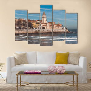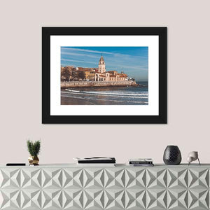 A photorealistic cityscape of San Lorenzo’s ocean beach with the San Pedro church, bell tower, red tile roofs and a cobblestone street. Rendered in blues, white, beige and brown with clear depth and framing, the scene feels serene and historic and suits coastal or modern room decor.