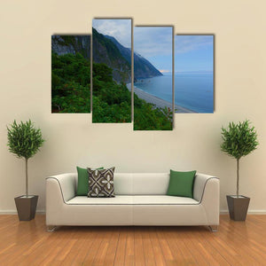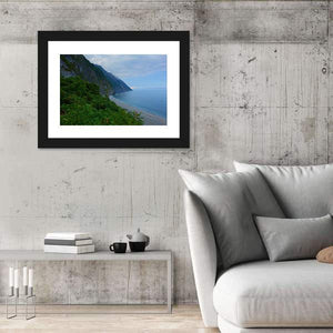 A landscape canvas showing coastal cliffs, a grey pebble beach and a calm blue ocean, with lush green vegetation on the cliffs. The rule-of-thirds composition creates a serene, majestic atmosphere that works well in modern living spaces and simple room decor.