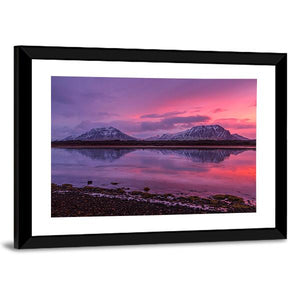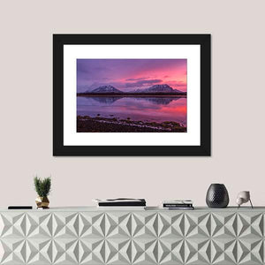 A symmetrical landscape of snow-capped mountains, a calm lake, and a vibrant sunset sky that reads serene and slightly dramatic. The modern palette of purple, pink, blue, and white gives the scene a tranquil, reflective mood—an understated focal piece for modern living rooms or bedrooms.