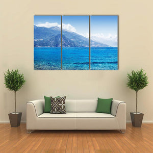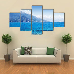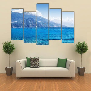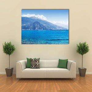Scenic Como Lake Panorama depicts Como Lake’s calm waters, a distant shoreline town, and layered mountains under a clear sky. The photorealistic landscape uses blue, green, white, and gray tones with a rule-of-thirds composition to create a peaceful, tranquil mood. Suitable for modern or nature-inspired room decor.