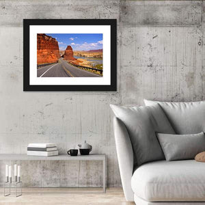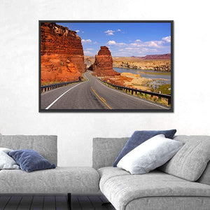 This realistic landscape shows a desert road curving past tall red rock formations toward distant mountains, with a body of water and blue sky with white clouds. The composition feels adventurous and vast, drawing the eye down the road into the scene. Suited to modern living rooms or hallways as nature-focused wall decor.