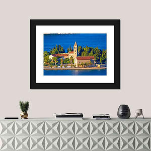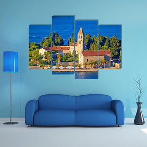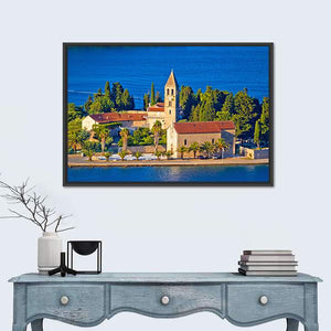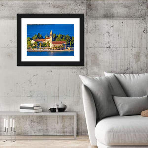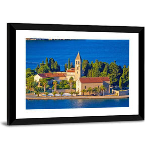 A serene daytime view of the island church on Vis, Croatia, showing red tile roofs, a bell tower, palm trees and the blue ocean. The bright, picturesque scene captures a coastal village and its architecture in calm, natural light, making it a good fit for coastal or Mediterranean room decor.