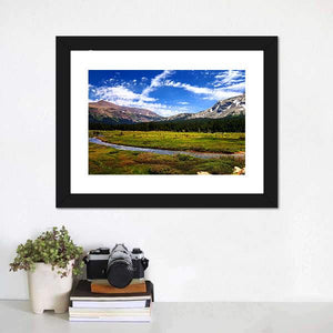 This panoramic canvas captures Colorado mountains, a winding river, dense evergreen forest, and a meadow beneath a partly cloudy sky. The realistic nature photography style and a palette of greens, blues, browns, and whites create a serene, majestic, and vast atmosphere. It fits modern or nature-inspired rooms such as living rooms and offices.