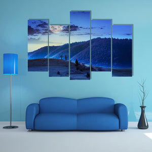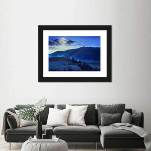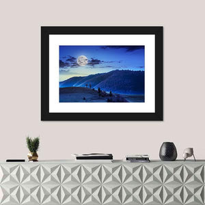 This modern canvas depicts mountains under a full moon with trees and fields arranged for depth using the rule of thirds. The blue, gray, black and white palette with touches of yellow and illuminated trees creates a mysterious, tranquil, cold night mood that suits modern home decor and nature-themed rooms.