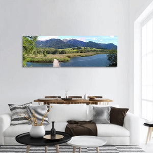 This panoramic canvas captures a summer lake scene with mountains, a bridge, reeds, and a wooden boardwalk. Rendered in realistic blues, greens, browns, and whites, it evokes a serene, expansive, natural mood and works well in modern or nature-inspired rooms as wall decor.