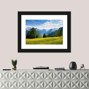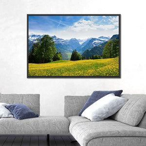 A photorealistic spring landscape that places a dense field of small yellow flowers in the foreground, with green trees and a snow-capped mountain range under a blue sky of wispy clouds. The scene feels peaceful, vibrant, and serene, with clear depth from foreground to distant peaks. It works well as a nature-focused accent in modern living rooms or bedrooms.