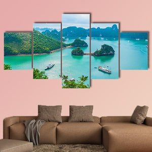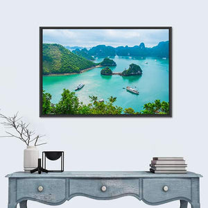 A realistic landscape print showing Halong Bay’s limestone karsts rising from emerald water, with several tourist boats and lush tropical foliage. The high-angle composition builds depth and a serene, slightly adventurous mood that works well in modern homes and quiet living spaces.