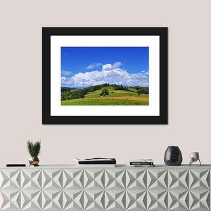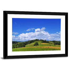 This canvas shows rolling hills and patchwork fields of green and yellow around Suwalszczyzna in Poland, with trees beneath a bright summer sky dotted with fluffy white clouds. The scene feels peaceful, serene, and bright. It suits modern room decor or nature-focused spaces.