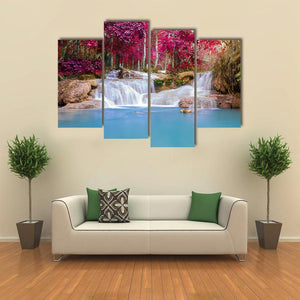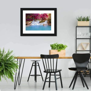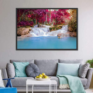 A landscape canvas of a multi-tiered waterfall set in a lush rain forest. Vivid pink foliage and clear blue water create a tranquil, vibrant, slightly ethereal mood. The vibrant, fantasy-inspired print works well as modern room decor.