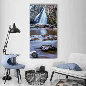 A photorealistic depiction of a waterfall and river, with smooth long-exposure water flowing over rocky terrain. The blue, gray, brown, and white palette creates a tranquil, natural mood. Suited to modern or nature-inspired rooms such as living rooms, bedrooms, or offices.