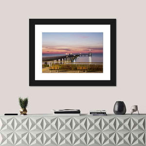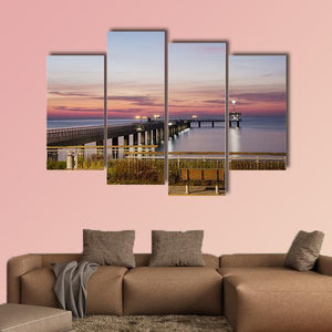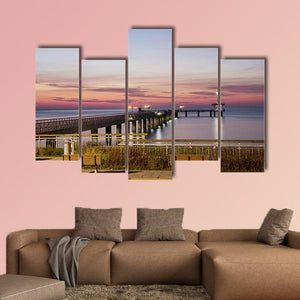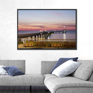 This photo-realistic canvas captures a pier stretching into Burgas Bay, Bulgaria at sunset, washed in soft pink, blue and orange tones with benches in the foreground and lights along the pier. The rule-of-thirds composition and tranquil colors create a calm, serene scene that fits modern coastal or nature-inspired rooms.