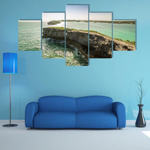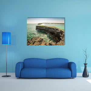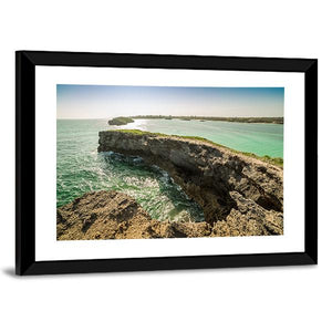 Seascape In Seven Islands Area captures ocean and rocky cliffs with sunlight glinting on the water and foaming waves along the shore. Rendered in a realistic style with blues, greens, browns and white highlights, the wide-angle, eye-level composition conveys a serene, natural, expansive mood. It fits coastal or nature-inspired rooms and modern interiors as understated wall decor.