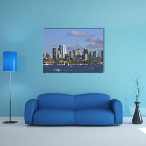 This canvas wall art captures the vibrant Seattle skyline reflected on the calm waters of the lake. Featuring modern skyscrapers and numerous sailboats, it brings a bright and active atmosphere to any space.