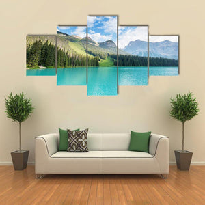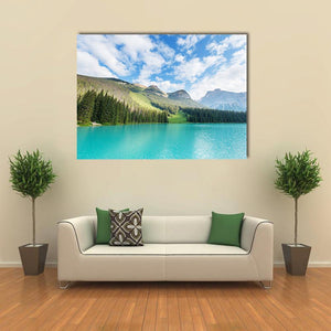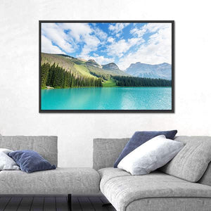 A photorealistic landscape of an emerald lake in Canada with clear turquoise water, a dense evergreen forest, and dramatic mountain peaks under fluffy white clouds. The scene feels serene and majestic, using cool blues and greens to create a tranquil atmosphere. It suits modern home living spaces and room decor that favor nature-inspired art.