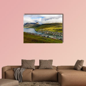 This canvas wall art captures a serene village nestled beside a fjord, framed by grass-covered mountains and wispy clouds. With its photorealistic detail and tranquil palette of greens and blues, it evokes a vast, natural beauty perfect for a calming atmosphere.
