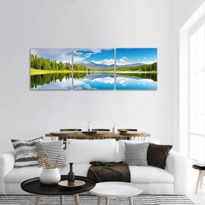 A panoramic, photorealistic view of a mountain lake with forest and open sky, showing a clear symmetrical reflection on the water. Cool blues and greens and soft clouds give the scene a serene, majestic mood that suits nature-inspired or modern room decor.