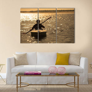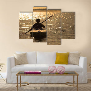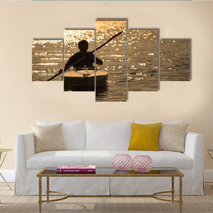 This canvas art features a serene silhouette of a kayaker at sunset, surrounded by sparkling water. Its golden and brown hues create a peaceful atmosphere, making it an ideal addition to modern spaces.