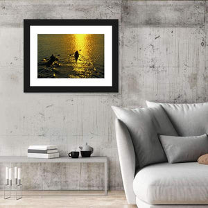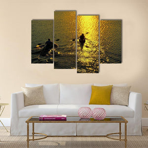 This canvas wall art captures a serene moment of kayakers gliding over a tranquil lake at sunset. The beautiful silhouette is set against a stunning palette of gold, yellow, and dark blue, evoking a peaceful atmosphere perfect for any modern decor.
