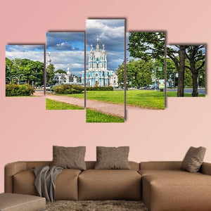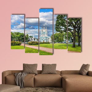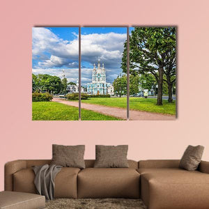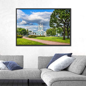 A photorealistic view of Smolny Cathedral set in a sunlit summer park. The ornate white church with blue accents sits beneath fluffy white clouds, with lush green grass, a path leading to the church, and a large tree on the right, creating a peaceful, scenic, bright atmosphere. Suited to modern room decor, entryways, or travel-inspired spaces.