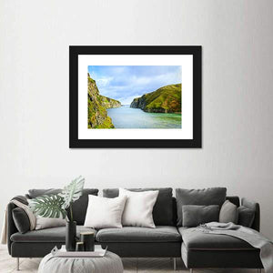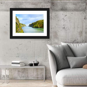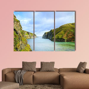 Smoo Cave Bay in Durness shows grassy coastal cliffs meeting open water beneath a cloudy sky. This photographic canvas uses a calm palette of blue, green, grey and white to create a sense of depth and serene, natural atmosphere. It pairs well with coastal or modern interiors and nature-focused rooms.