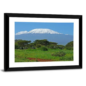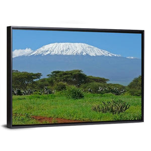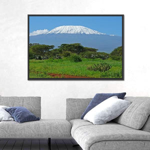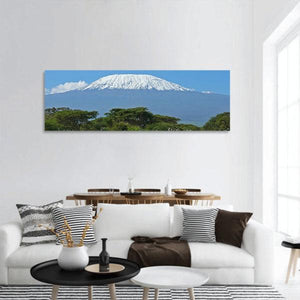 This panoramic canvas beautifully captures the serene majesty of Mount Kilimanjaro, surrounded by acacia-like trees and a clear sky. The realistic palette of blue, white, and green evokes a sense of vastness, making it a stunning addition to any nature-inspired décor.