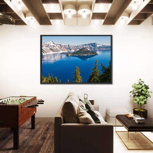 This canvas art captures a serene scene of Crater Lake, showcasing its clear blue waters surrounded by lush evergreen trees and majestic, snow-capped mountains. The photorealistic style brings the natural beauty of this landscape to life, making it a wonderful addition to any room.