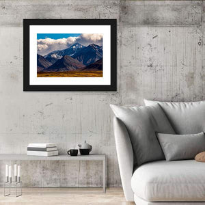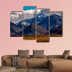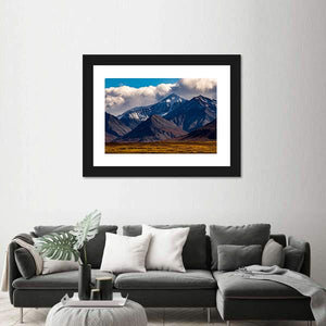 A mountain scene of Denali with snow-capped peaks, dramatic cloud formations, and golden autumn grass in the foreground. Composed with strong depth and a rule-of-thirds layout, it feels majestic, serene, and a little wild—suitable for modern or nature-inspired rooms.