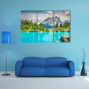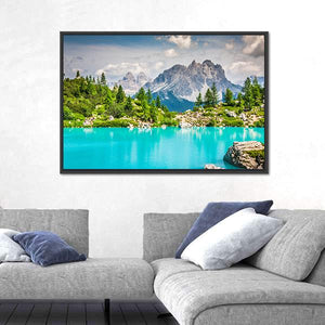 Sorapis Lake with the Dolomite Mountains shows a mountain lake scene framed by pine trees and jagged peaks. Turquoise water, a blue-green palette, and fluffy clouds create a serene, majestic, and vibrant atmosphere. It suits room decor in modern or nature-inspired living spaces.