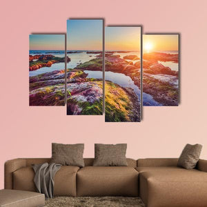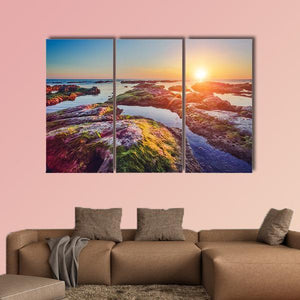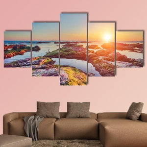 South Coast of Sicily, Italy — a photorealistic landscape showing a rocky shore and calm ocean at sunset. Moss-covered rocks and glassy water create a low-angle sense of depth and a serene, warm mood. Suited to modern and coastal-inspired rooms like living rooms and bedrooms.