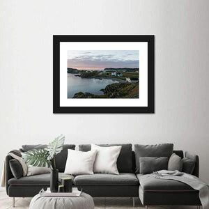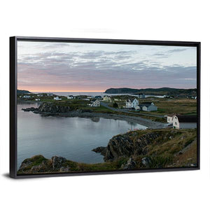 South Twillingate Island in Canada shows a quiet coastal town with small white houses on rocky cliffs beside calm water, rendered in a realistic palette of blue, green, gray and soft pink. The scene feels serene and composed with clear depth and framing, and it suits coastal or modern interiors seeking a peaceful focal piece.