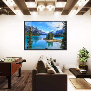 Spirit Island in Maligne Lake is a photorealistic panoramic landscape of a small forested island, turquoise lake water, and snow-capped mountains. The scene feels serene and majestic, suited to modern or nature-inspired rooms.