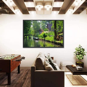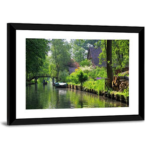 Spree Forest House On The Water captures a tranquil scene of a thatched-roof house beside a calm canal, with a wooden bridge, boat, trees and flowers reflected in the water. The realistic greens, browns and blues create an idyllic, natural mood that pairs well with nature-inspired or modern decor.