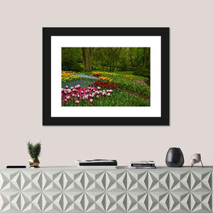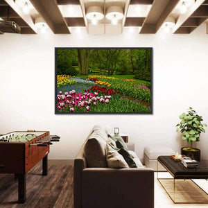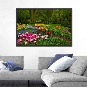 Keukenhof tulip field rendered in photorealistic detail, showing a garden of pink, white, yellow, red and blue tulips with lush green grass and a woodland background. The composition uses depth and the rule of thirds to create a vibrant, cheerful, and serene spring mood, making it a natural fit for modern homes and living rooms.