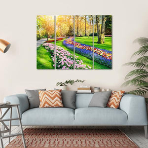 This canvas art captures a vibrant spring landscape filled with multicolor tulips, lush greenery, and sunlight filtering through trees. Its realistic depiction of a peaceful park scene adds serenity and charm to any wall.