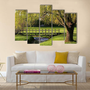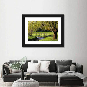 Spring Scene Canvas Wall Art shows a peaceful spring landscape with a weeping willow beside a sunlit creek and a wooden bridge. Painted in a realistic style with green, brown, yellow and blue tones and composed using the rule of thirds, it brings a calm, natural presence to modern home decor and nature-themed rooms.