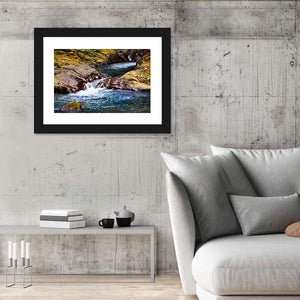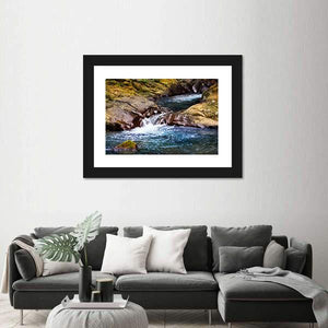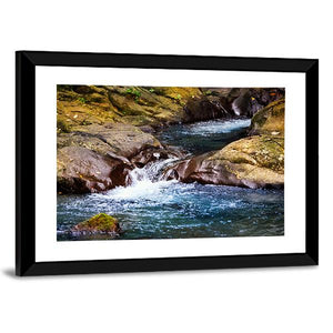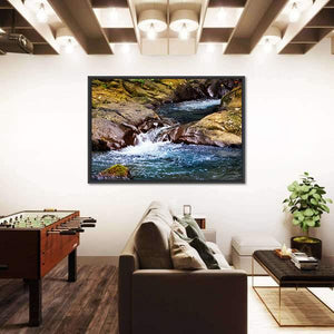A tranquil rain-forest stream with small waterfalls, white-water rapids and mossy rocks rendered in a realistic, eye-level view. Cool blues, greens and warm browns create a refreshing, natural mood that suits modern living rooms and bedrooms.