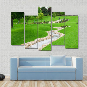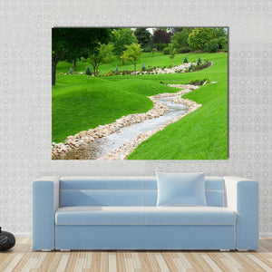 This canvas art features a serene landscape of a winding stream bordered by lush grass and trees. The peaceful vibe is perfect for bringing a touch of nature into your home.