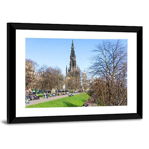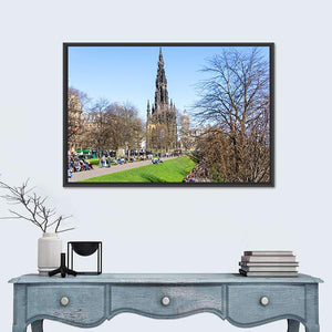 A street view of historic Old Town houses in Edinburgh, with the tall Scott Monument rising beyond a sunny park and people on the lawn. Rendered realistically in greens, blues, browns and grays, the scene feels pleasant, sunny and lively and makes a warm addition to wall decor in living spaces.