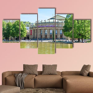 This realistic landscape shows the Stuttgart State Theatre beside calm Eckensee Lake, framed by trees and classical architecture. The green, blue, tan, and white palette creates a serene, grand atmosphere that suits modern or classic room decor.