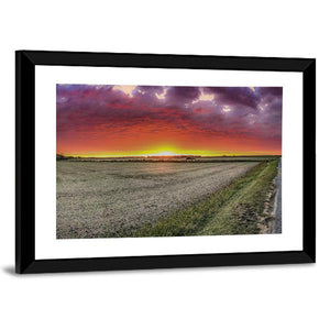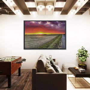 A panoramic landscape of a summer field under a glowing sunset, with dramatic clouds and a rural road on the right. Warm reds, oranges, yellows and touches of purple and green create a colorful, serene yet dramatic mood that suits modern or nature-inspired rooms.