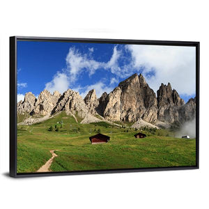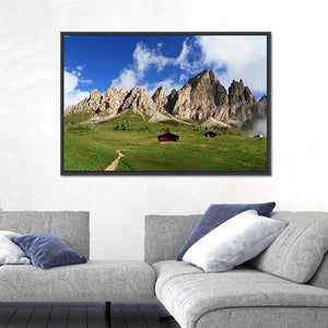 This serene canvas art captures a rustic summer landscape in Italy, featuring majestic mountains, a winding dirt path, and two charming wooden cabins nestled in a lush green meadow. The peaceful palette of greens, blues, and browns enhances the tranquil atmosphere of nature.