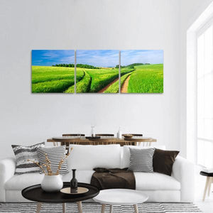 A photorealistic panoramic view of a dirt road winding through lush green fields beneath a blue sky with light clouds. The scene feels peaceful and expansive, a calm choice for living rooms or bedrooms seeking a natural, modern touch.