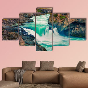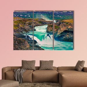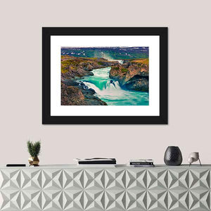 A view of Godafoss waterfall and its turquoise river framed by rocky cliffs and distant mountains. The scene feels both serene and powerful, rendered in cool greens and blues with brown and grey rock tones—suited to modern, nature-focused rooms.