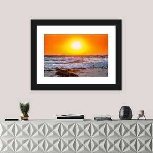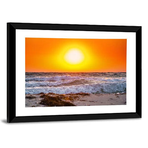This photorealistic canvas captures a summer sunrise breaking above a stormy sea, with waves crashing on the shore and seaweed scattered along the beach. Warm oranges and yellows blend with cool blues and whites to create a serene, peaceful atmosphere that fits modern or coastal home decor.