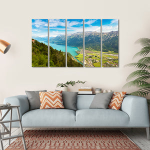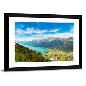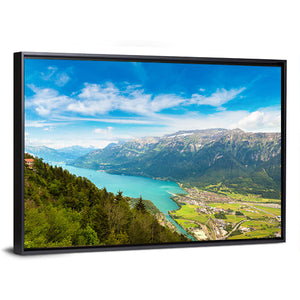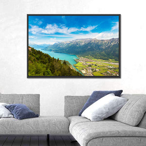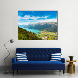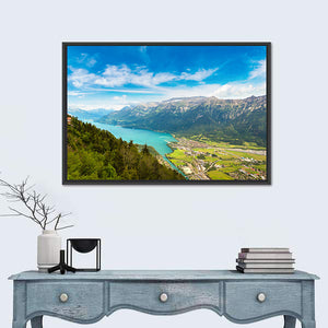 This canvas art captures the serene beauty of Interlaken, Switzerland, featuring a vibrant turquoise lake surrounded by lush green valleys and majestic mountains. The realistic high-angle view conveys a tranquil, scenic atmosphere perfect for any nature lover.
