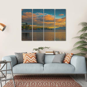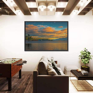 This canvas art showcases a serene lake scene in Lake George, New York. Featuring a vibrant palette of orange, blue, and green, it captures the calmness of nature with picturesque mountains and dramatic sunset clouds reflecting on the water's surface.