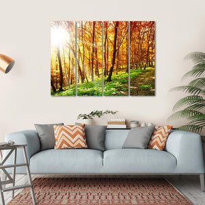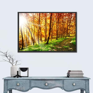 This stunning canvas art captures sunlight filtering through trees in a serene autumn forest. With a warm palette of gold, green, and orange, it evokes a peaceful atmosphere perfect for any nature lover.