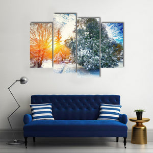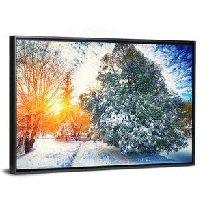 This canvas art captures a serene snowy park scene, featuring snow-covered trees and sunlight streaming through the branches. The vibrant colors and peaceful winter atmosphere make it a delightful addition to any space.