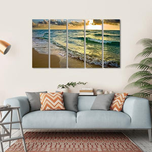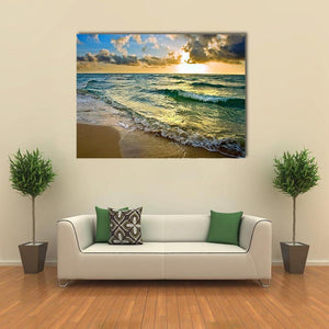 This canvas captures the serene beauty of ocean waves at sunrise along the Atlantic Ocean Coast near Florida. The tranquil colors of blue, green, and gold come together to create a peaceful atmosphere, making it a perfect addition to any modern decor.